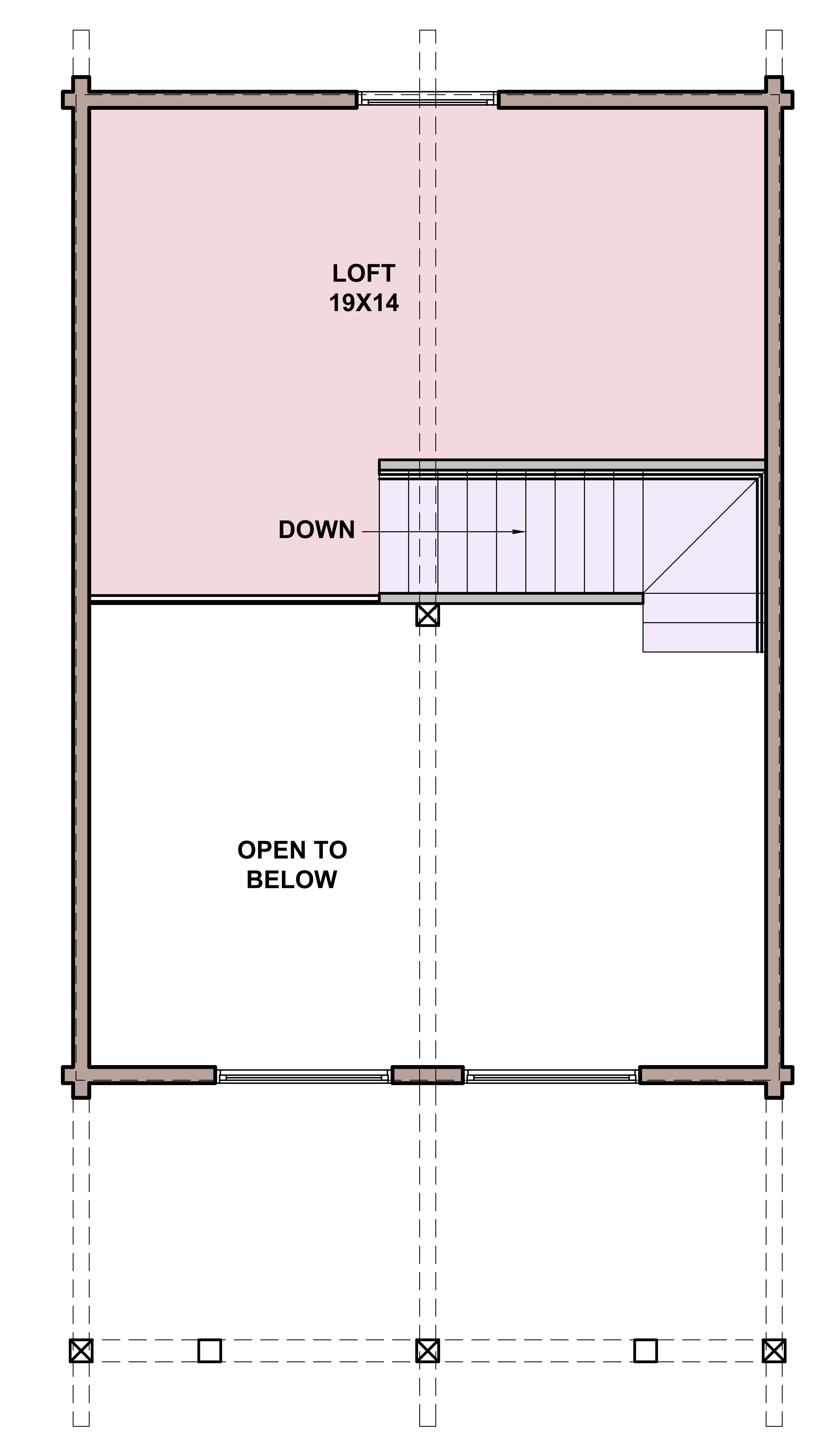 The loft space is open living space, allowing it to be customized into a second bedroom if desired. This floor plan depicts a one bedroom, one bathroom layout.
